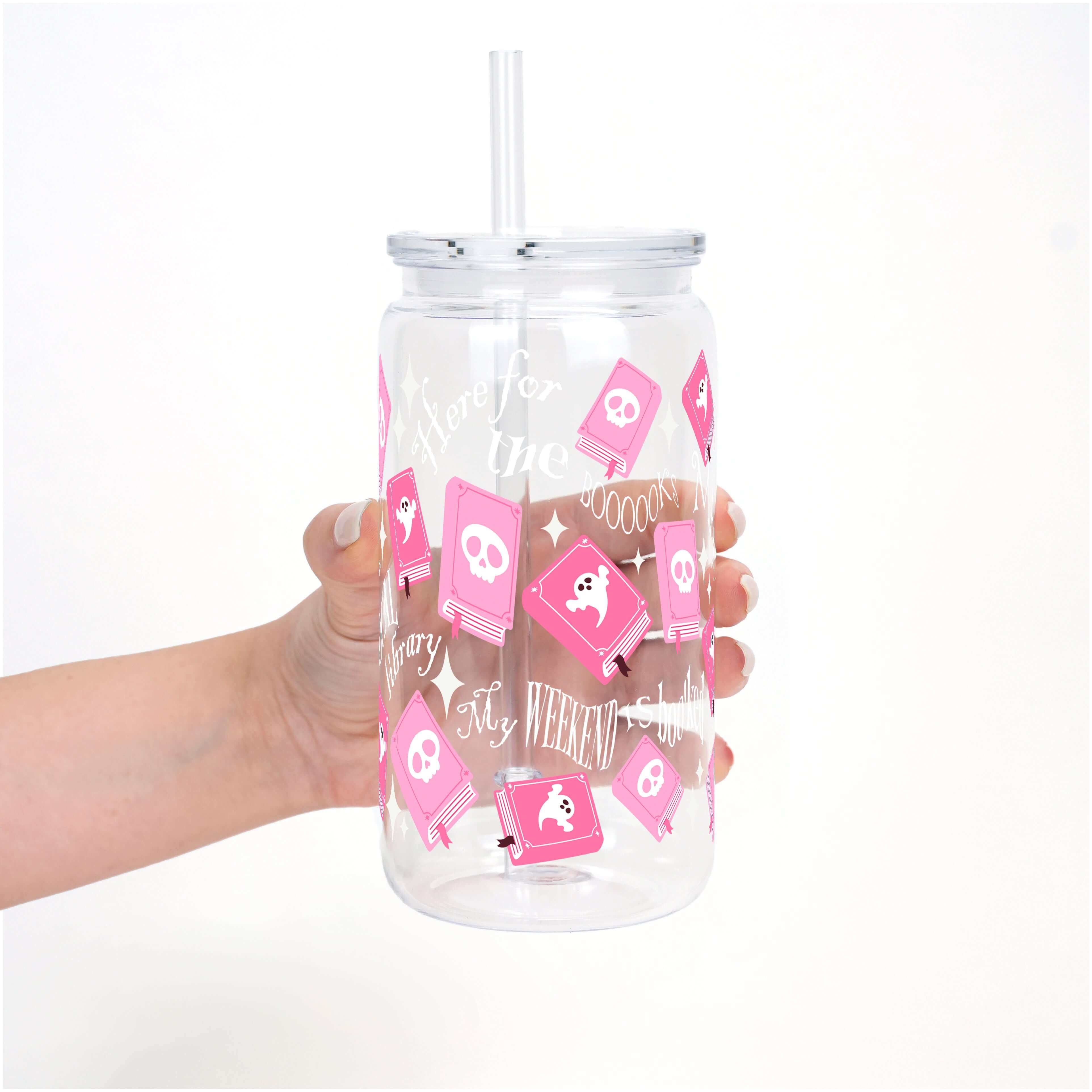 Witchy plots, haunted libraries, and a TBR stack taller than your broomstick? Same. This pink ghost-book design is basically fall’s coziest reading companion, featuring spooky little details like skull covers, ghost pages, and playful phrases like “Here for the boooooks” and “May contain spells & plot twists.” Whether you’re binging thrillers or rereading your favorite fantasy, this one’s for the babes who never leave home without a book... or a beverage.