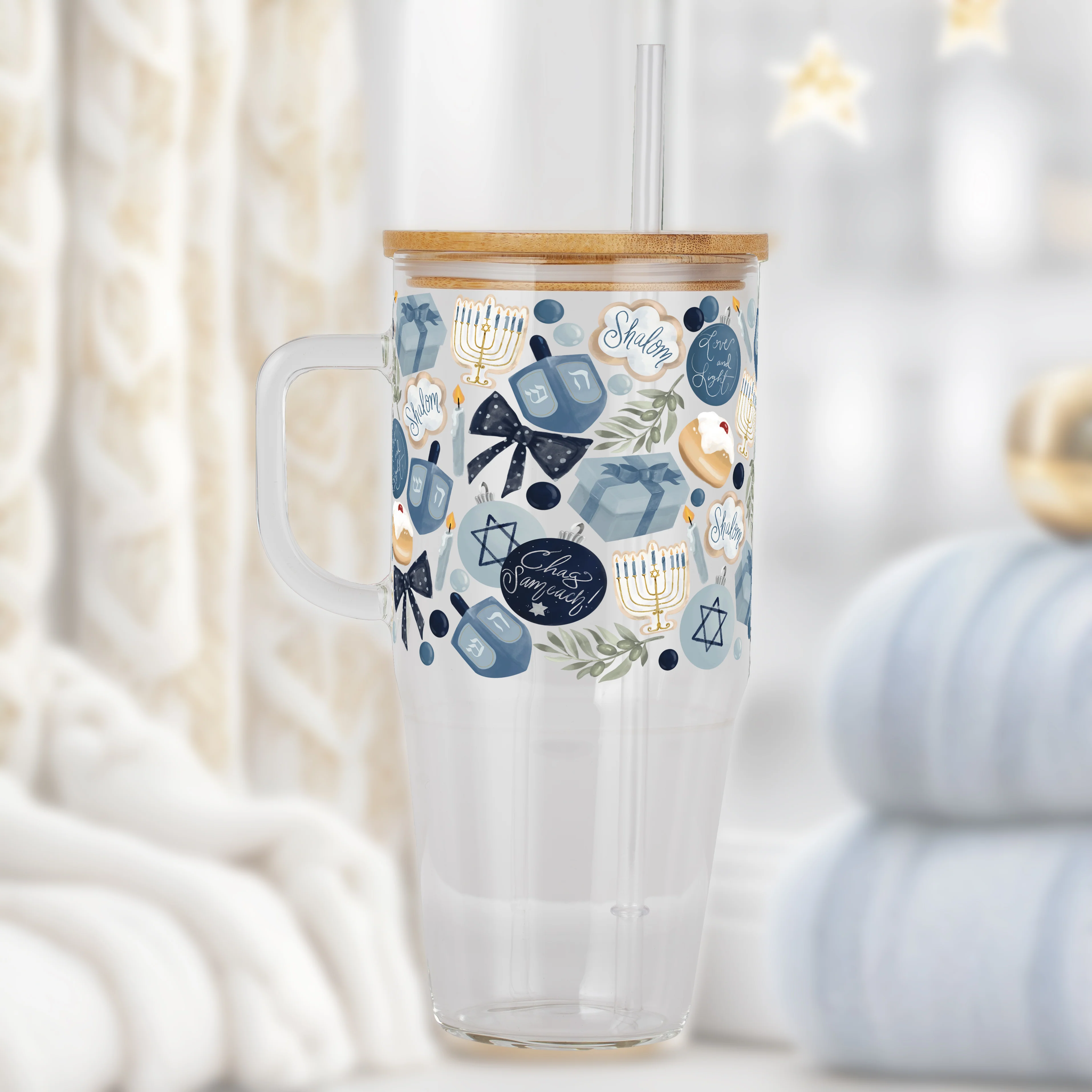 Cozy Hanukkah Tumbler with Handle Lid & Straw