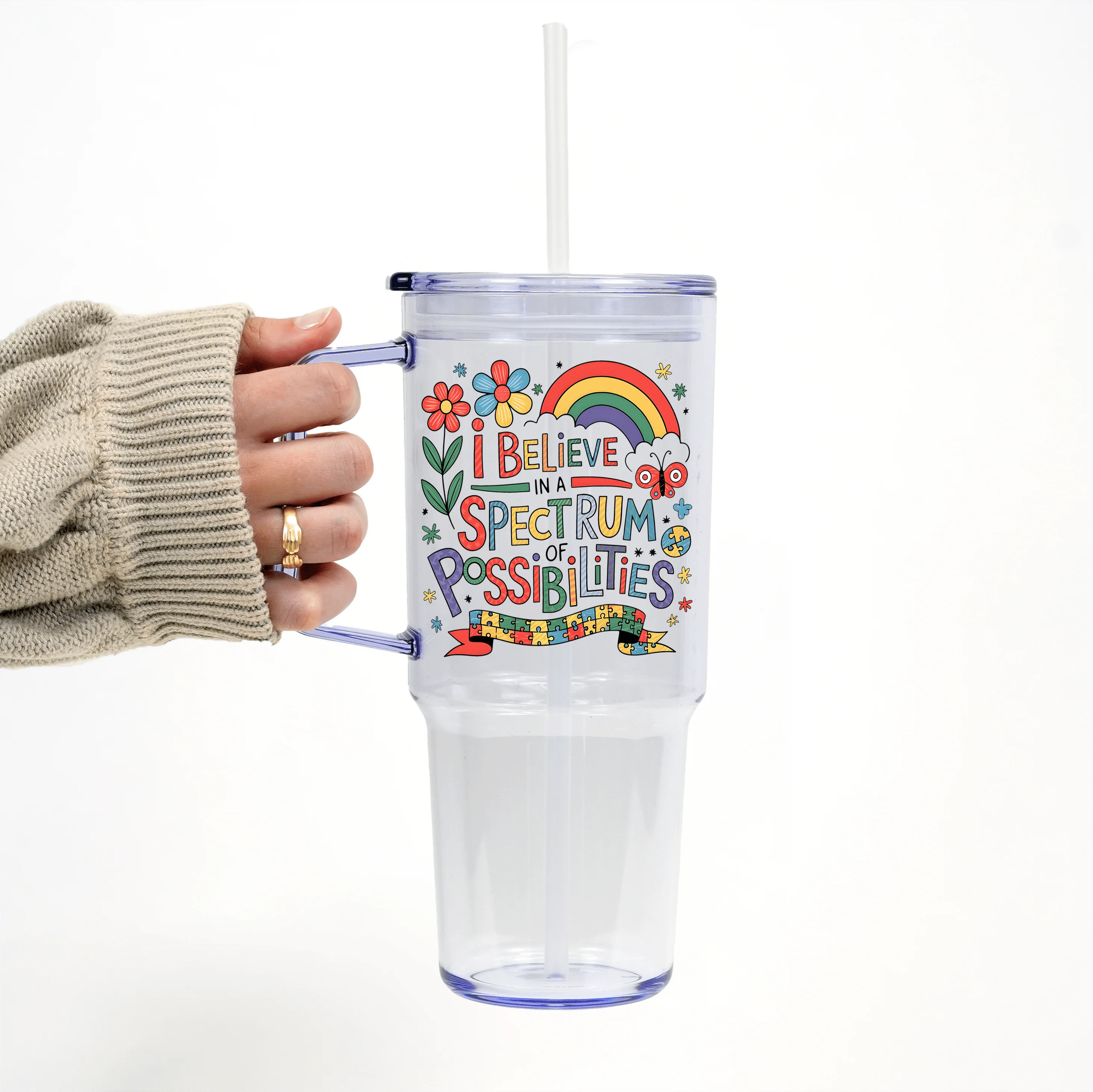 This vibrant tumbler celebrates neurodiversity and the endless potential of every mind. Featuring playful typography, colorful puzzle pieces, flowers, and a rainbow, this uplifting design reads âI Believe in a Spectrum of Possibilities.â Itâs a joyful statement of inclusion, hope, and strengthâperfect for Autism Acceptance Month and every day after.